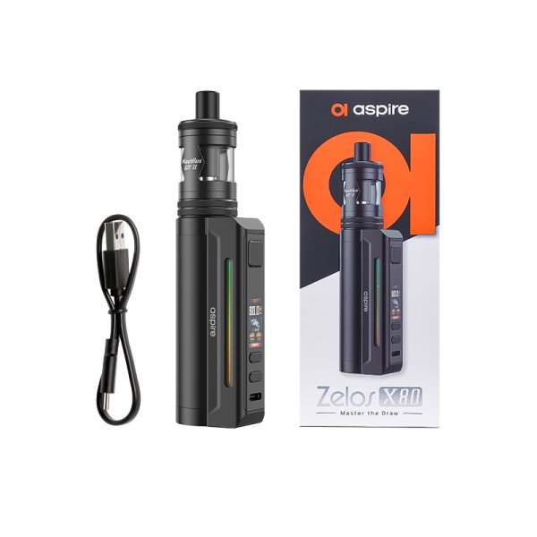 A refined fusion of power and style, this is the exceptional combo from Aspire: Zelos X80 and Nautilus GT II.Powered by a single 18650 battery (not included).Adjustable power from 5 to 80 watts.5 modes: Wattage, Voltage, Bypass, CPS, and TC.4.5ml capacity with top-filling.Compatible with Nautilus series coils.Adjustable bottom airflow, perfect for MTL to DL draw.Clear and readable 0.96" TFT display.Manual switch to lock the box.Multiple protections guarantee 100% safe vaping.Recommended retail price 64.90€