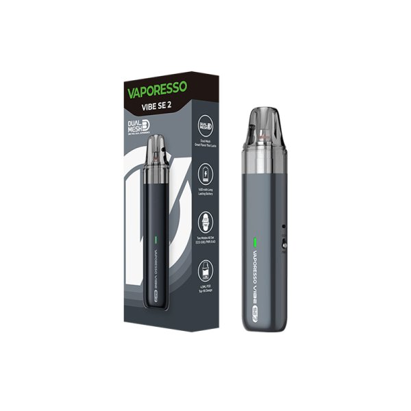 Discover the Vibe SE 2 by Vaporesso, an elegant pod that combines performance with a modern design.Built-in 1400mAh battery recharging via USB-C (cable not included).Adjustable power with two modes: ECO (0.8ohm, 15W) and PWR (0.6ohm, 28W).4.5ml capacity with side filling.Built-in Dual Mesh coil with a value of 0.6–0.8ohm.Compatible with Vibe Dual Mesh series cartridges.Adjustable airflow, perfect for MTL to RDL draw.RGB LED indicating remaining battery life.Activation by inhalation.Recommended retail price 17.90€