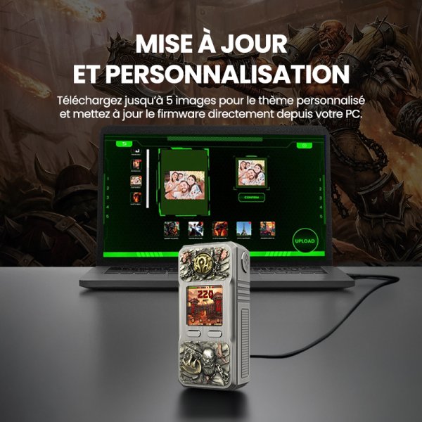 With the Rayden 220 Orgrim Limited Edition mod, enter the brutal and untamed world of the Orcs, where strength, honor, and war reign supreme.Each mod is a unique piece of art with a finish never before achieved in the world of vaping.Powered by two 18650 batteries.New XT Ultra GT 220 V1.0 chipset.Bypass or Power with 5 modes of use: MTL, Soft, Normal, Hard, and Pro (custom power curve).Adjustable power from 5 to 220 watts.Advanced customization thanks to a multitude of selectable themes as well as a "custom" mode allowing you to import an image from a PC.Dedicated software allowing both updating and customization of the mod's interface, and which will bring new features soon.Flush with atomizers with a diameter of 26mm.Brushed aluminum body with CNC machining.Limited edition of 3000 pieces worldwide.Recommended retail price 139.00€
