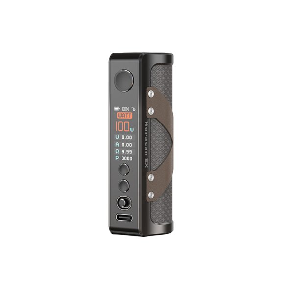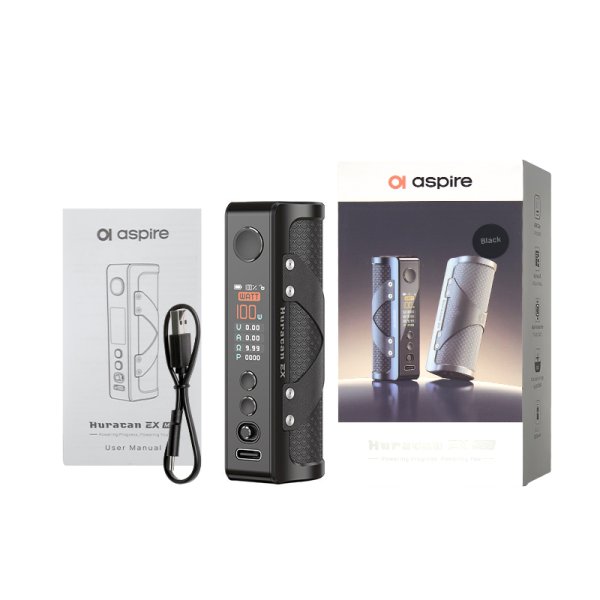 Discover the new Huracan EX Mod from Aspire, a practical and compact mod.Works with a fast-charging 18650 battery (2A) through USB-C (not included).Adjustable power from 5 up to 100 watts maximum.0.96" TFT display in compact and elegant color.5 use mode : WATT, VOLTAGE, BYPASS, CPS, TC.Multiple protections for a 100% secure vape.Recommended retail price: 39.90€