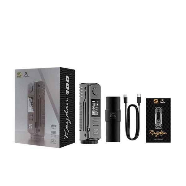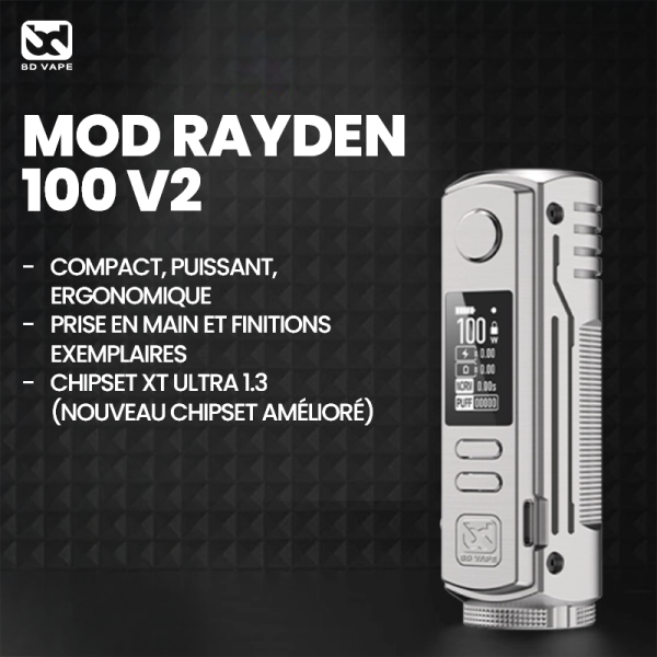 Compact, powerful, ergonomic... Three words that define the Rayden 100 mod to perfection!Alloy design giving it great robustness.Exemplary handling and finishes.Works with a 18650/21700 battery (not included).Adjustable power up to 100 watts maximum.XT ULTRA 1.3 chipset (New Enhanced Chipset) with customizable colors.On/off switch to wake or turn off the Rayden mod very easily.What's New in Version 2.0 !+20% responsiveness compared to V1.5.Premium finish with a scratch-resistant coating for exceptional durability.New battery hatch, designed to eliminate any risk of overheating and short circuits.Refined buttons for optimal sensitivity.2-year warranty.Recommanded retail price 59.90€ / Rainbow color 64.90€
