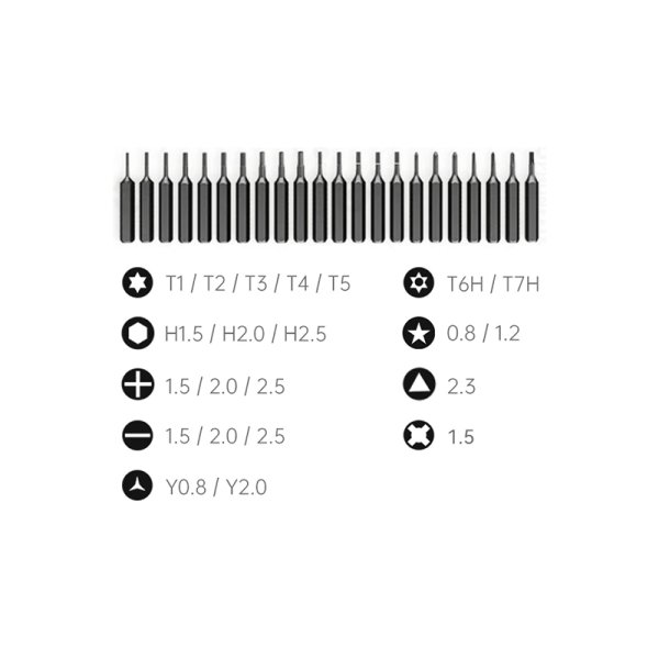 • Tournevis de précision comprenant un manche, 22 embouts et des accessoires ainsi qu'une boîte de transport.